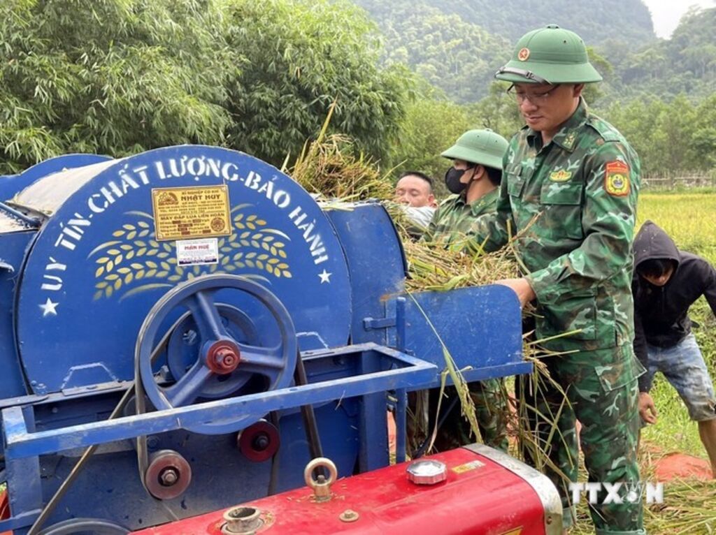 | Cán bộ chiến sỹ Đồn Biên phòng Cà Xèng (Quảng Bình) hỗ trợ đồng bào Rục thu hoạch lúa. |