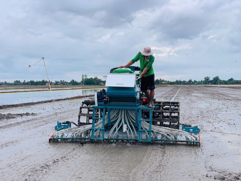 The Hong Phat Agricultural Services Cooperative conducts mechanical rice sowing in Tuong Thang B Hamlet, Vinh Thanh Commune, Phuoc Long District, Bac Lieu Province. Photo by courtesy/VNA
