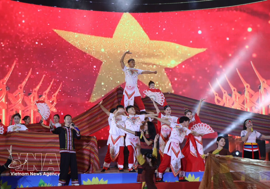 | A special art programme is held in Dien Bien province in 2025 to celebrate the 50th anniversary of the Liberation of the South and the national reunification, the 71st anniversary of the Dien Bien Phu Victory, and the 135th anniversary of the birth of President Ho Chi Minh. (Photo: VNA) |