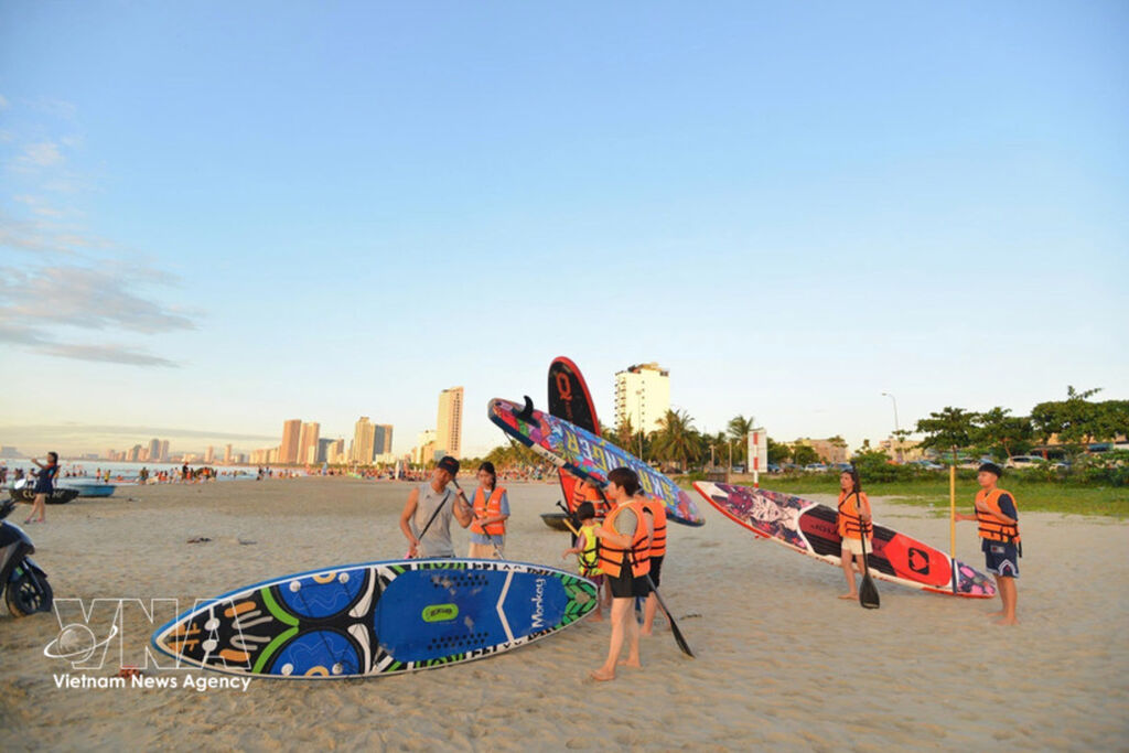 | Tourists prepare to surf off the coast of Da Nang. (Photo: VNA) |