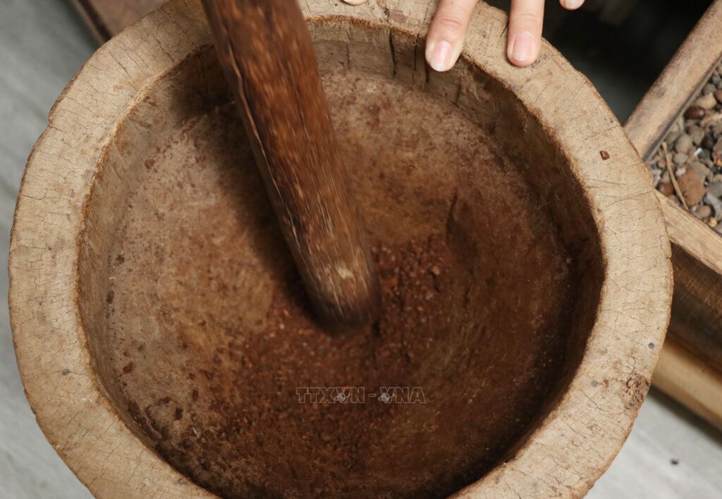 pounded using a rice mortar. This method produces coffee grounds that are not
