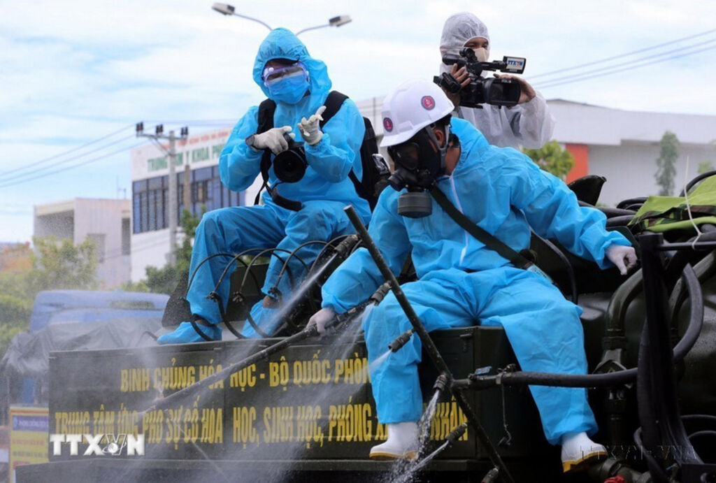 | A reporter from the VNA Television Centre’s Da Nang bureau works from the back of a truck spraying disinfectant in high-risk COVID-19 areas of Son Tra, Da Nang city. (Photo: VNA) |