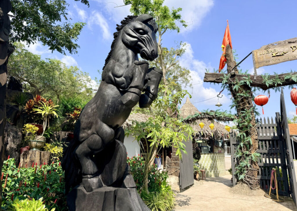 From the entrance onwards, driftwood is everywhere. Some trunks serve as pillars, others arch into bridges. Several large pieces are stacked and interlocked to create an observation tower rising approximately 26 metres above ground. From its summit, visitors can take in sweeping views of the Tien River and the orchards that blanket Cu Lao Gieng. Smaller pieces retain their organic shapes, repurposed as planters, pedestals or decorative accents.