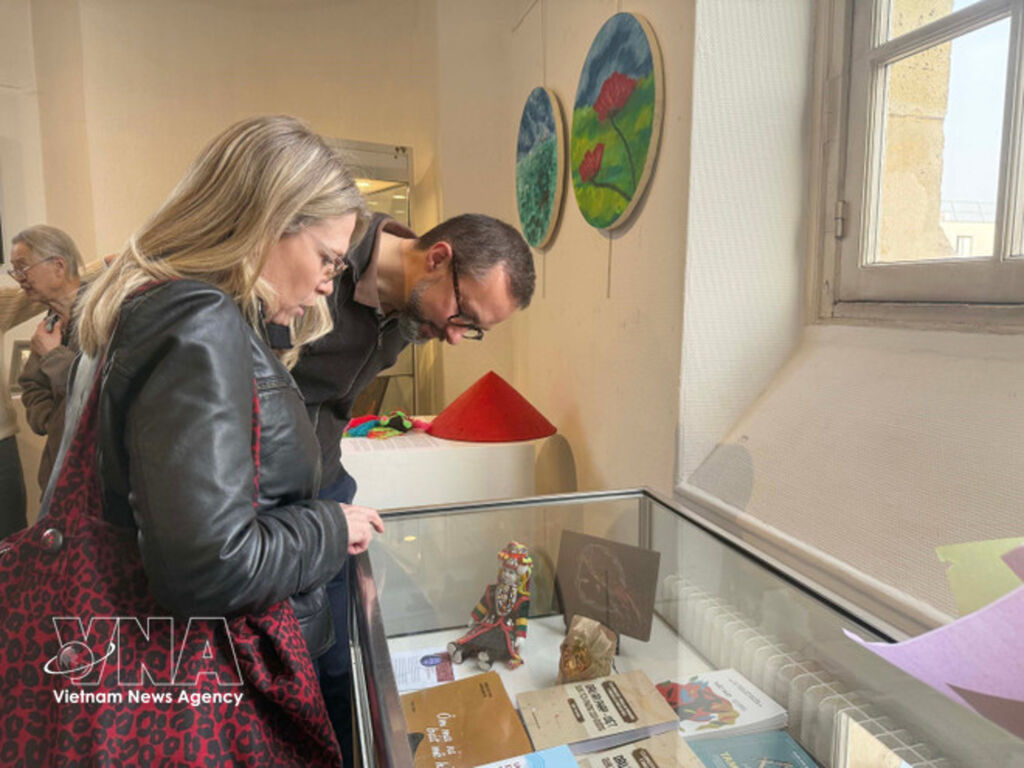 | Visitors explore paintings and books at the “Vietnamese Soul on French Soil” exhibition in France. (Photo: VNA) |