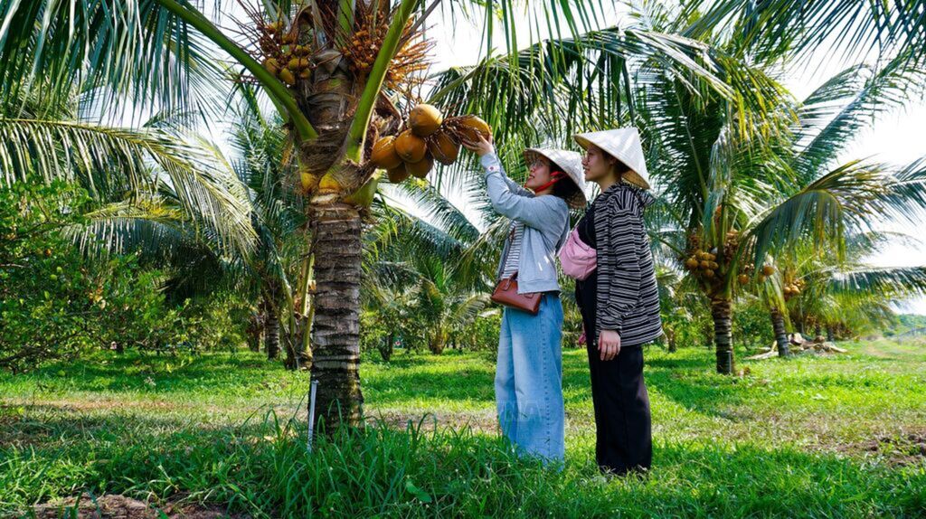 Visitors explore and experience coconut gardens at the foot of Ba Den Mountain (Tay Ninh province), a model being developed by many farmers in association with agricultural tourism. Photo: Minh Phu – VNA