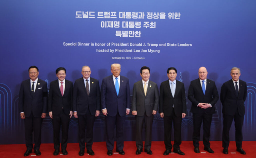 | President Luong Cuong (third, right) poses for a group photo with leaders of the Asia-Pacific Economic Cooperation (APEC) economies at the 32nd APEC Economic Leaders' Week in Gyeongju, the Republic of Korea, on October 29, 2025. (Photo: VNA) |