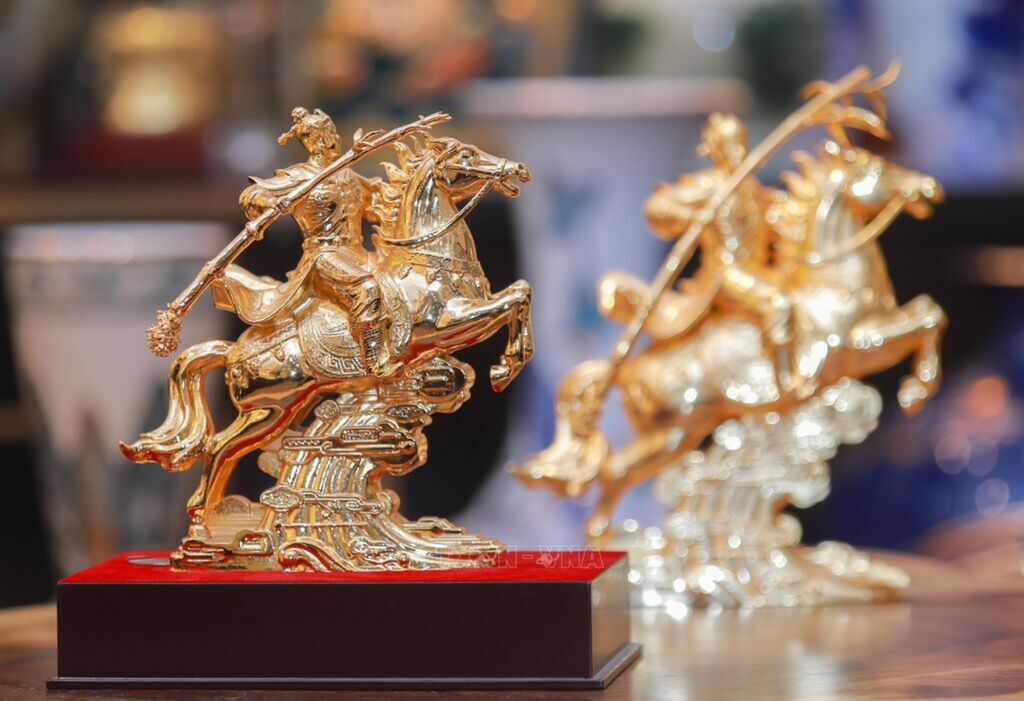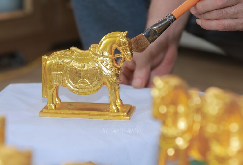 Meritorious artisan Nguyen Thien Hung, Chairman of the Kieu Ky Gold and Silver Craft Association, inspects the final stages of a 70 x 40 cm gold-plated Phu Dong statue made of Bat Trang ceramics before delivering it to a customer. Photo: Phan Phuong – VNAGold-plated horse artworks in Kieu Ky craft village are made from various materials such as ceramics, bronze, wood, resin and lacquer, offering a luxurious appearance and high durability. Photo: Phan Phuong – VNAA highlight of this Tet season is the artwork “Sacred Giong’s Flying Horse,” cast based on a design by sculptor and painter Vu Dung, combining traditional lacquer, bronze and 24K gold-leaf gilding techniques. Photo: Phan Phuong – VNAArtisans focus on final refinements, carefully inspecting every detail of the horse mascots to ensure the gold-plated surface is glossy and luxurious, and that products are delivered on schedule for Tet. Photo: Phan Phuong – VNAGold-plated horse artworks in Kieu Ky craft village (Gia Lam, Hanoi) are meticulously handcrafted using gold leaf and traditional lacquer-and-gilding techniques. Photo: Phan Phuong – VNA
