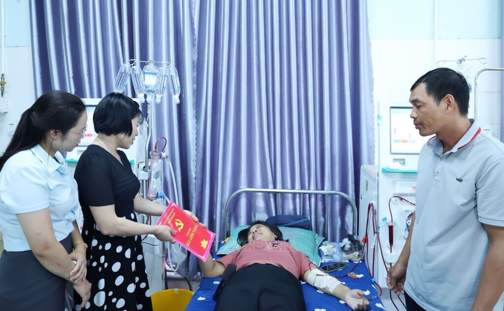 A sick person receives “Golden Hammer and Sickle Savings Book”. VNA Photo: Hoài Thu