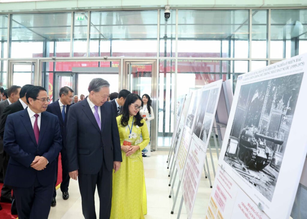 | Party General Secretary To Lam, Prime Minister Pham Minh Chinh, and other delegates visit a photo exhibition organised by the Vietnam News Agency. (Photo: VNA) |