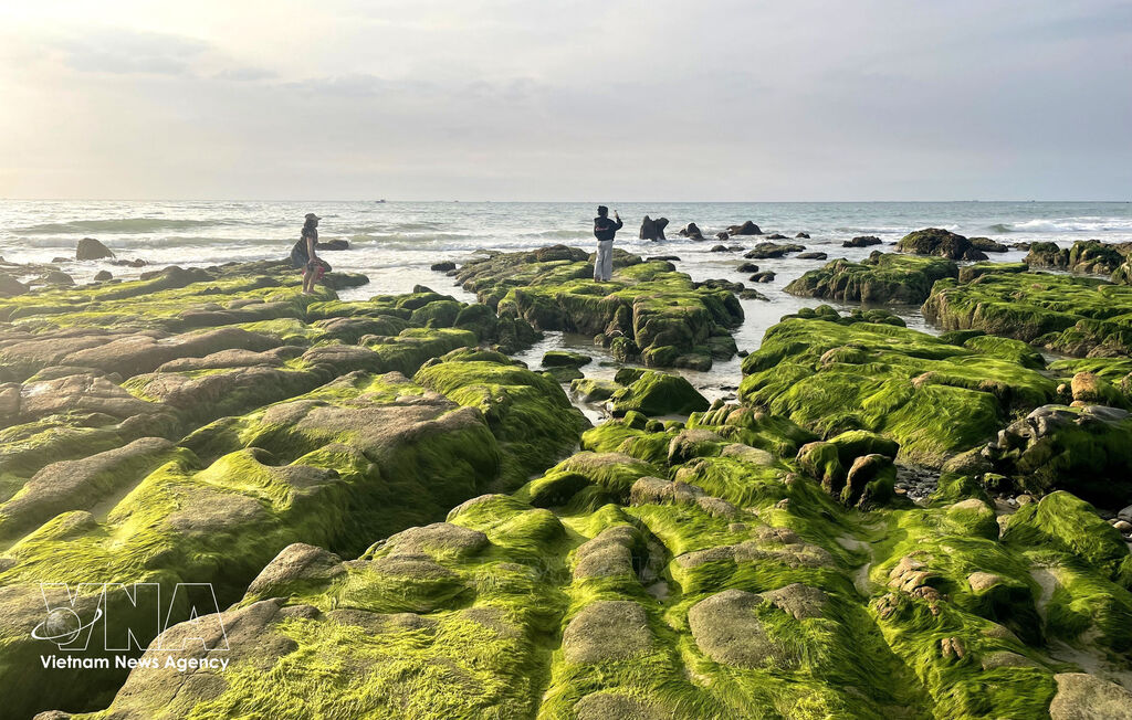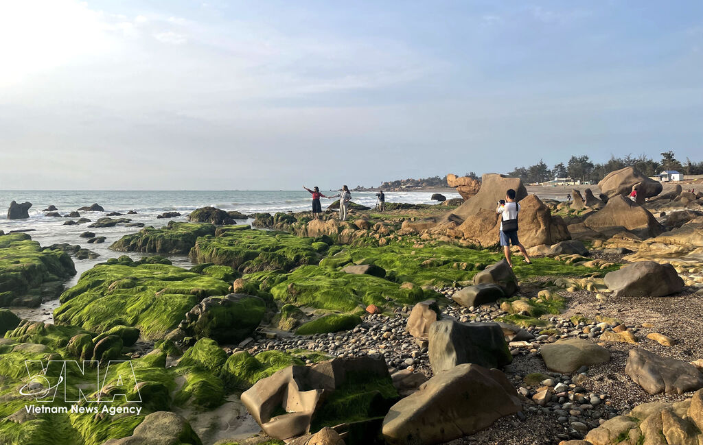 During these days, moss has flourished across the rocky outcrops of Co Thach – Binh Thanh beach in Lien Huong commune, the Central Highland province of Lam Dong, creating a lush green expanse along the coastline. Ba Khom rock bank appears to be adorned in a soft, velvet-like emerald coat, attracting a multitude of locals and tourists alike for sightseeing and photography.