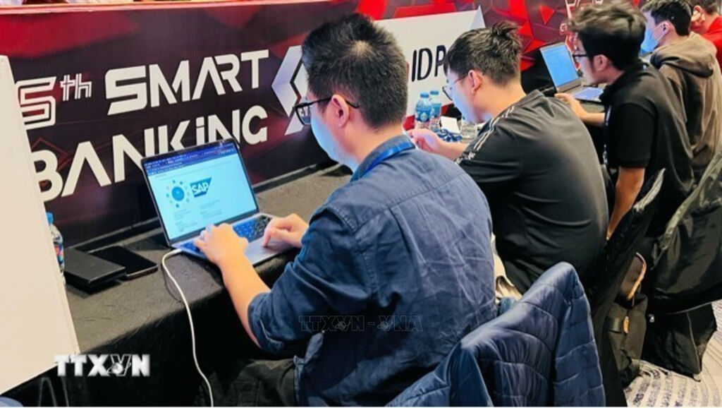 | Technology engineers participate in a cybersecurity drill in the financial and banking sector. (Photo: VNA) |