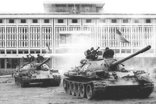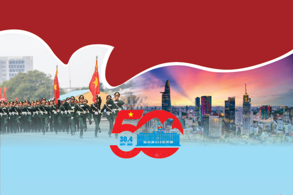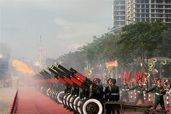 People interact with soldiers after parade celebrating 50th anniversary of Liberation of South and National Reunification Day