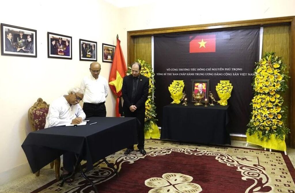 General Secretary of the Communist Party of Bangladesh Ruhin Hossain Prince wrote in the condolence book that his party will forever remember and treasure Trong for his substantial contributions to the development of a modern Vietnam and the corruption combat.