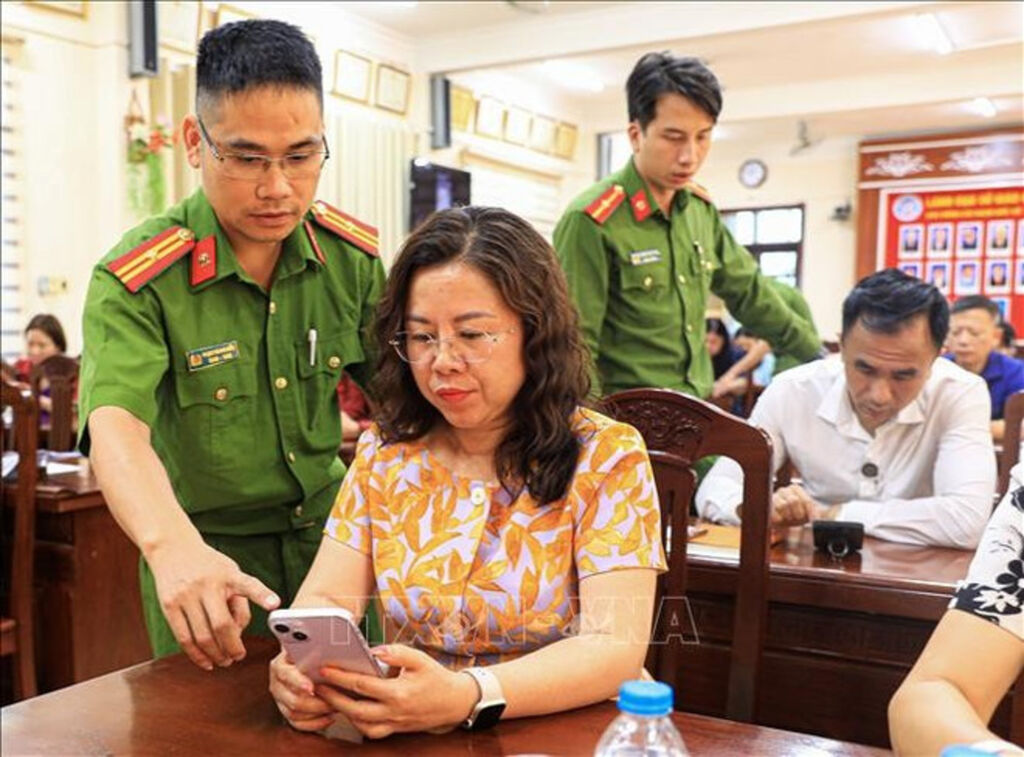| Public security officers of Dien Bien province provide local people with guidance on commenting on the draft amendments and supplements to the 2013 Constitution via VNeID on personal smartphones. (Photo: VNA) |