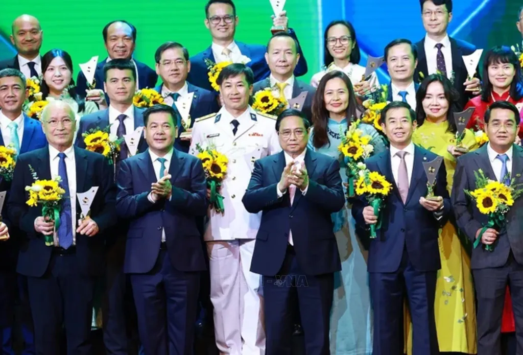 | Prime Minister Pham Minh Chinh poses for a photo with representatives from awarded enterprises (Photo: VNA) |