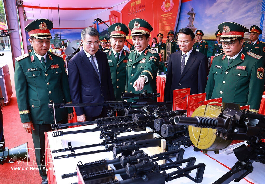 | Prime Minister Le Minh Hung and officials visit an exhibition showcasing technical innovations by Military Region 4 at the ceremony on April 18. (Photo: VNA) |