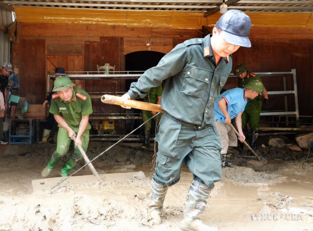 Police in Mu Cang Chai district (Yen Bai) help people in Ho Bon commune to clean up houses after a natural disaster. Photo: Tuan Anh - VNA