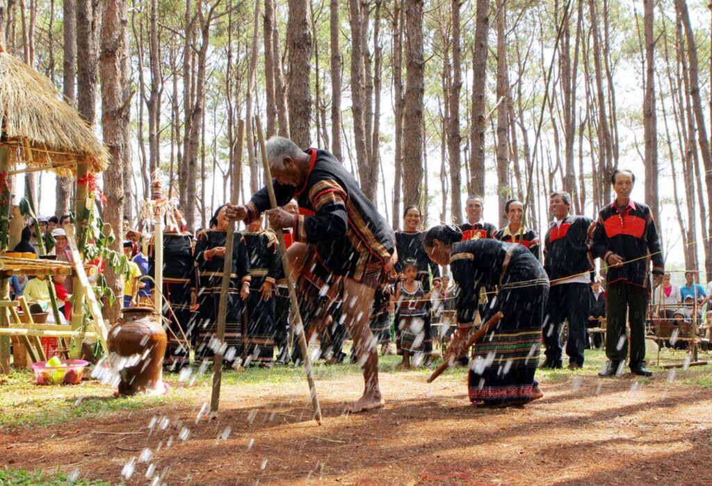 Early spring is thetime when the E De ethnic minority group in the Central Highlands region enjoythe festive time with a ritual praying for fertile crops. This is one of theimportant rituals of the E De people, which takes place when a new cropplanting season begins. They believe that the ritual will bring them goodweather and a bumper crop. Photo: Duong Giang – VNA