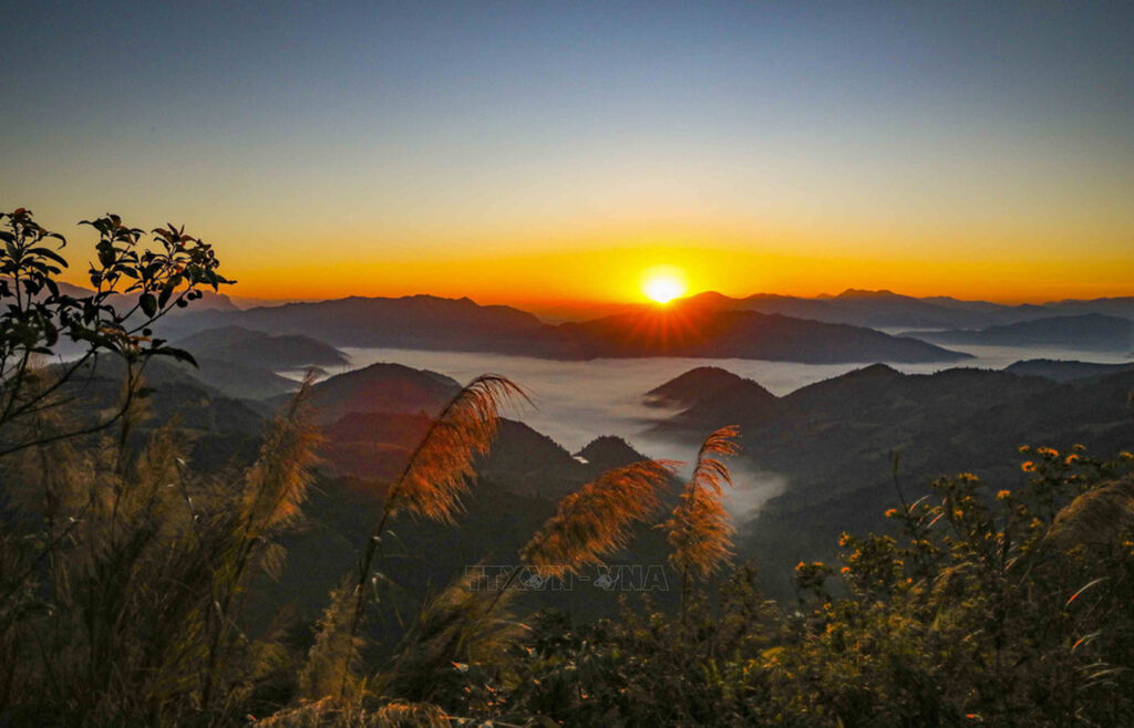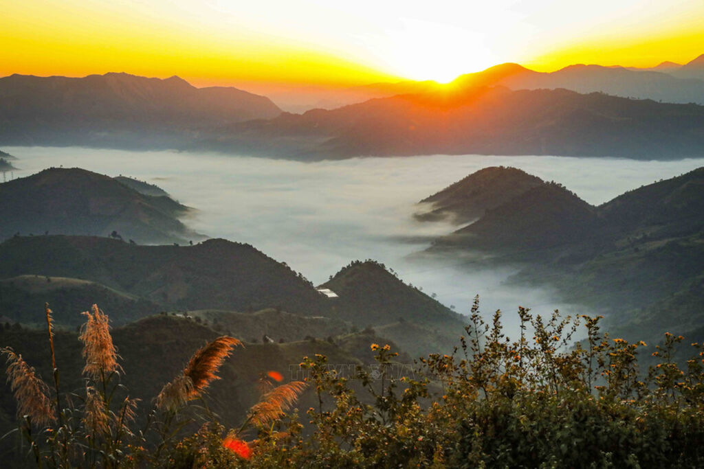 At dawn, Keo Lom Pass in Na Son commune in Dien Bien province awakens above a vast sea of white clouds filling the valley below. In the golden sunrise, layers of mountains appear faint and dreamy, creating a natural scene that is both majestic and poetic. This unspoiled beauty makes Keo Lom an appealing destination for visitors and those who love the landscapes of the northwest mountains.