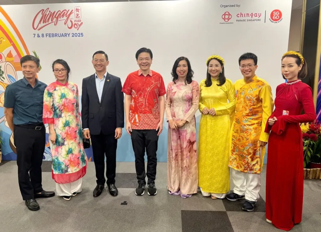 | Deputy Minister of Foreign Affairs Le Thi Thu Hang, Chairwoman of the State Committee for Overseas Vietnamese Affairs (fourth from right) meets with Singaporean Prime Minister Lawrence Wong (fourth from left) as part of the Chingay Parade. (Photo: Vietnamese Ministry of Foreign Affairs) |