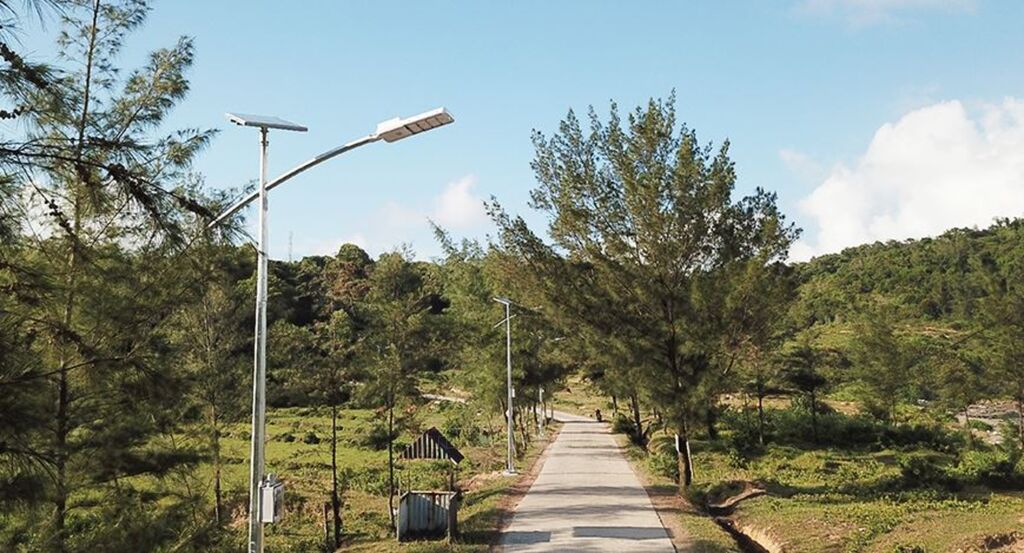 | Solar-powered streetlights from the lighting project are installed for testing along a road to Mong Rong rock beach in Co To island district, Quang Ninh province. (Photo: rangdong.com.vn) |