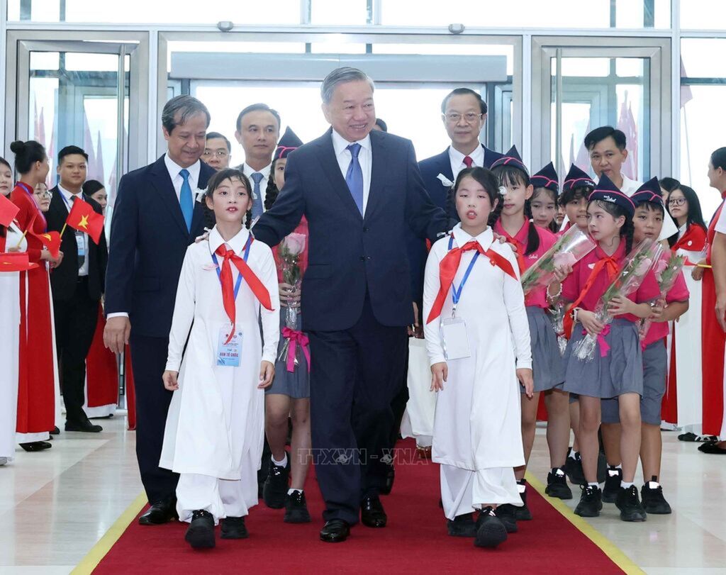 Opening ceremony at Tran Phu High School (Phu Tho Hoa Ward, Ho Chi Minh City). Photo: Trung Tuyen – VNAOpening ceremony at Tran Phu High School (Phu Tho Hoa Ward, Ho Chi Minh City). Photo: Trung Tuyen – VNAStudents of Xin Chai Semi-boarding Ethnic Primary and Secondary School, Lao Chai border commune (Tuyen Quang), attend the opening ceremony. Photo: Duc Tho – VNADao ethnic women accompany their children to school for the opening ceremony. Photo: Duc Tho – VNAFirst-grade pupils attend the opening ceremony at Duc Xuan Secondary School branch (Hoa An Commune, Cao Bang). Photo: Chu Hieu – VNAStudents at Duc Xuan Secondary School branch (Hoa An Commune, Cao Bang) eagerly return to school on opening day. Photo: Chu Hieu – VNAStudents of Thoai Ngoc Hau High School for the Gifted (Long Xuyen Ward, An Giang Province) follow the opening ceremony online from the main venue in Hanoi. Photo: Cong Mao – VNAStudents of Mac Dinh Chi High School, Hai Phong City, on opening day of the new academic year. Photo by courtesy/VNATeachers and students of Ngoc Chien Secondary School (Ngoc Chien Commune, Son La Province) joyfully begin the new school year. Photo: Quang Quyet – VNATeachers and pupils of Le Hong Phong Primary School (Ha Long Ward, Quang Ninh) salute the national flag during the 2025-2026 opening ceremony. Photo: Thanh Van – VNAOverview of the Ceremony marking the 80th anniversary of the education sector and the opening of the 2025-2026 academic year at Hanoi National University of Education. Photo: Le Dong – VNATeachers and students of Ha Giang Ethnic Boarding High School celebrate the opening of the 2025-2026 academic year. Photo: Minh Tam – VNAChairman of Da Nang People’s Committee Luong Nguyen Minh Triet greets students at the opening ceremony of Pham Van Dong Secondary School (Ba Na Commune). Photo: Khoa Chuong – VNAPupils and teachers of Trung Yen Primary School (Yen Hoa Ward, Hanoi) attend the online opening ceremony. Photo: Huy Hung – VNAWelcoming ceremony for 10th-grade students at Phan Huy Chu High School (Hanoi). Photo by courtesy/VNAParents accompany their children to school for the opening day on Da Tay Island, Truong Sa (Spratly) Archipelagoes, Khanh Hoa Province. Photo by courtesy/VNAParty General Secretary To Lam, along with leaders and former leaders of the Party and State, attend the ceremony marking the 80th anniversary of the education sector, receiving the First-class Labor Order, and inaugurating the 2025-2026 academic year. Photo: Thong Nhat – VNAParty General Secretary To Lam beats the ceremonial drum to inaugurate the 2025-2026 academic year. Photo: Thong Nhat – VNA