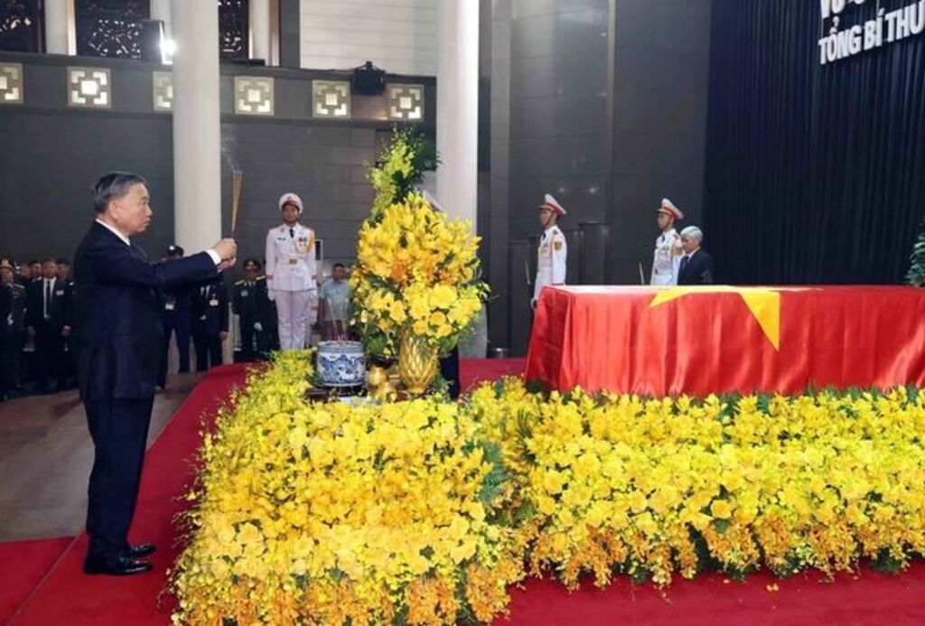 Former Party General Secretary Nong Duc Manh; former Presidents Nguyen Minh Triet, Truong Tan Sang, Nguyen Xuan Phuc, and Vo Van Thuong; former PM Nguyen Tan Dung; former NA Chairmen Nguyen Sinh Hung, Nguyen Thi Kim Ngan, and Vuong Dinh Hue; along with many other incumbent and former leaders of the Party and State also came to pay the last respects to General Secretary Trong and extend condolences to his family.