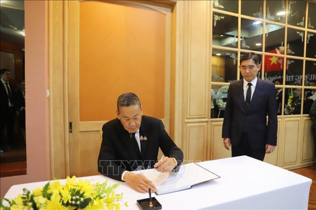 | Thai Prime Minister Srettha Thavisin writes in the condolence book at the respect-paying ceremony at Vietnamese Embassies in Thailand on July 25. (Photo: VNA) |