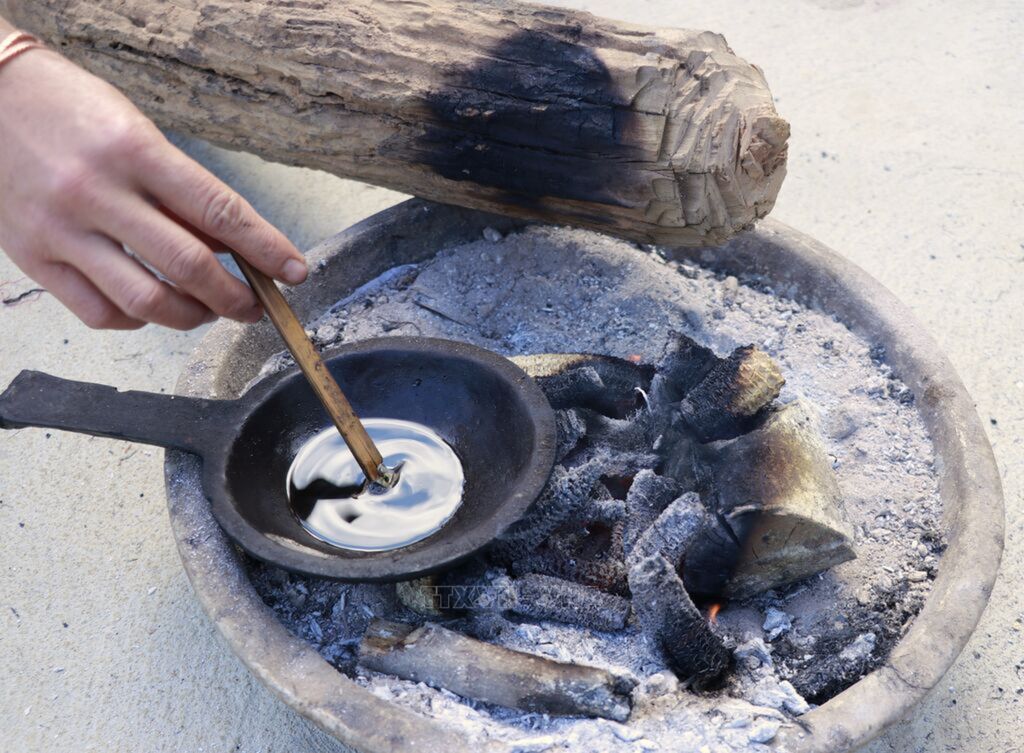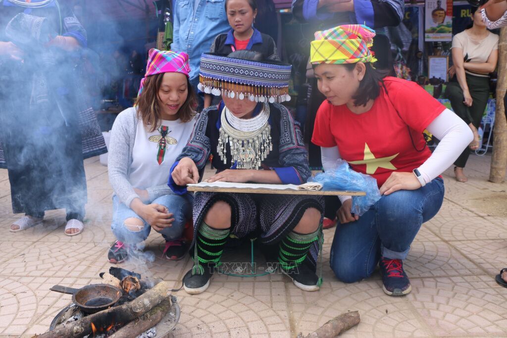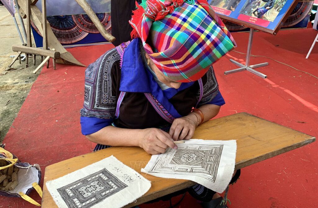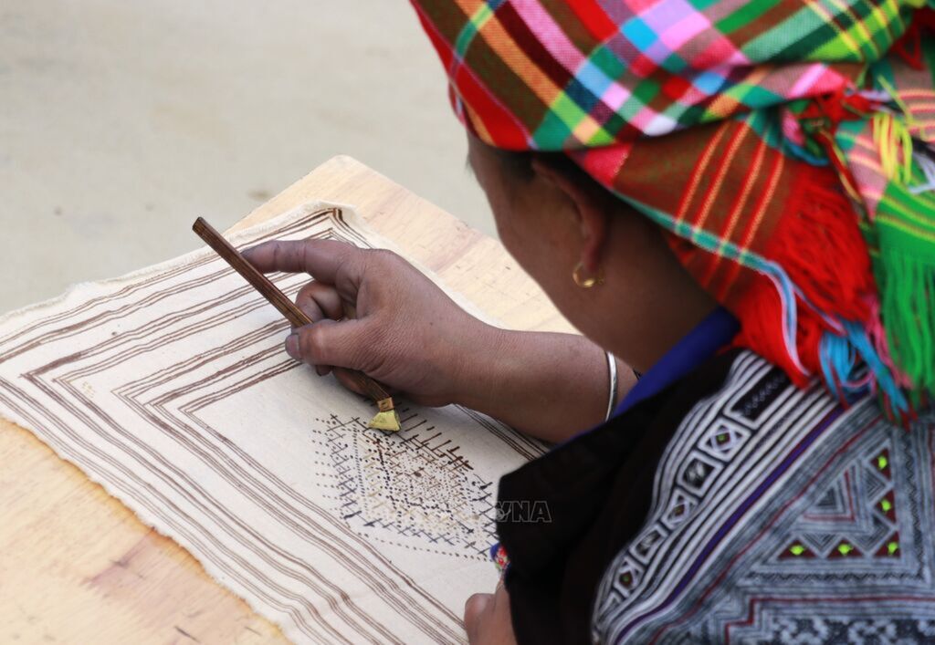 Handicraft products of Mong ethnic people. To create durable deep indigo blue, the fabric is dyed many times. It is soaked in indigo water then dried in the sun, and this process is repeated several times. Photo: VNATo create decorative patterns on brocade, they heat beeswax and then use a pen dipped in melted wax to draw directly on the fabric. The waxy part when dyeing will not absorb the colour, creating dark and light tones on products. Photo: VNAMost local people wear traditional costumes embroidered with decorative patterns created from beeswax, combined with dyeing and fabric stitching techniques. Photo: VNATo create decorative patterns on brocade, they heat beeswax and then use a pen dipped in melted wax to draw directly on the fabric. The waxy part when dyeing will not absorb the colour, creating dark and light tones on products. Photo: VNAThe technique using melted beewax in creating patterns on brocade clothes is a traditional craft of H'Mong people. To create decorative patterns on brocade, they heat beeswax and then use a pen dipped in melted wax to draw directly on the fabric. Photo: VNATo create decorative patterns on brocade, they heat beeswax and then use a pen dipped in melted wax to draw directly on the fabric. The waxy part when dyeing will not absorb the colour, creating dark and light tones on products. Photo: VNALy Thi Ninh introduces beeswax techniques to visitors. Photo: VNAWith skilled hands and a rich imagination, local women use beeswax to create unique floral patterns that embellish traditional products such as handbags, wallets, scarves, and clothing. Photo: VNATo create decorative patterns on brocade, they heat beeswax and then use a pen dipped in melted wax to draw directly on the fabric. The waxy part when dyeing will not absorb the colour, creating dark and light tones on products. Photo: VNAH'Mong's technique of creating decorative patterns on brocade using beeswax is a sophisticated work that requires meticulousness. Photo: VNA