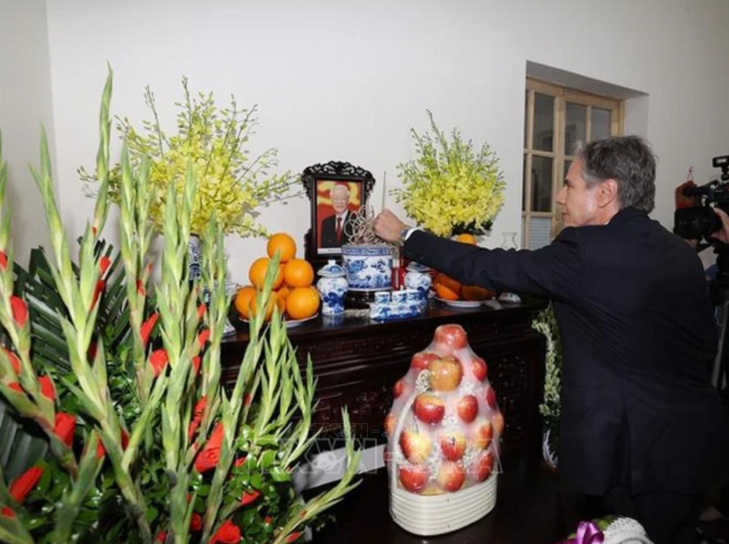 | Secretary Blinken offers incense in memory of General Secretary Trong at his house (Photo: VNA) |