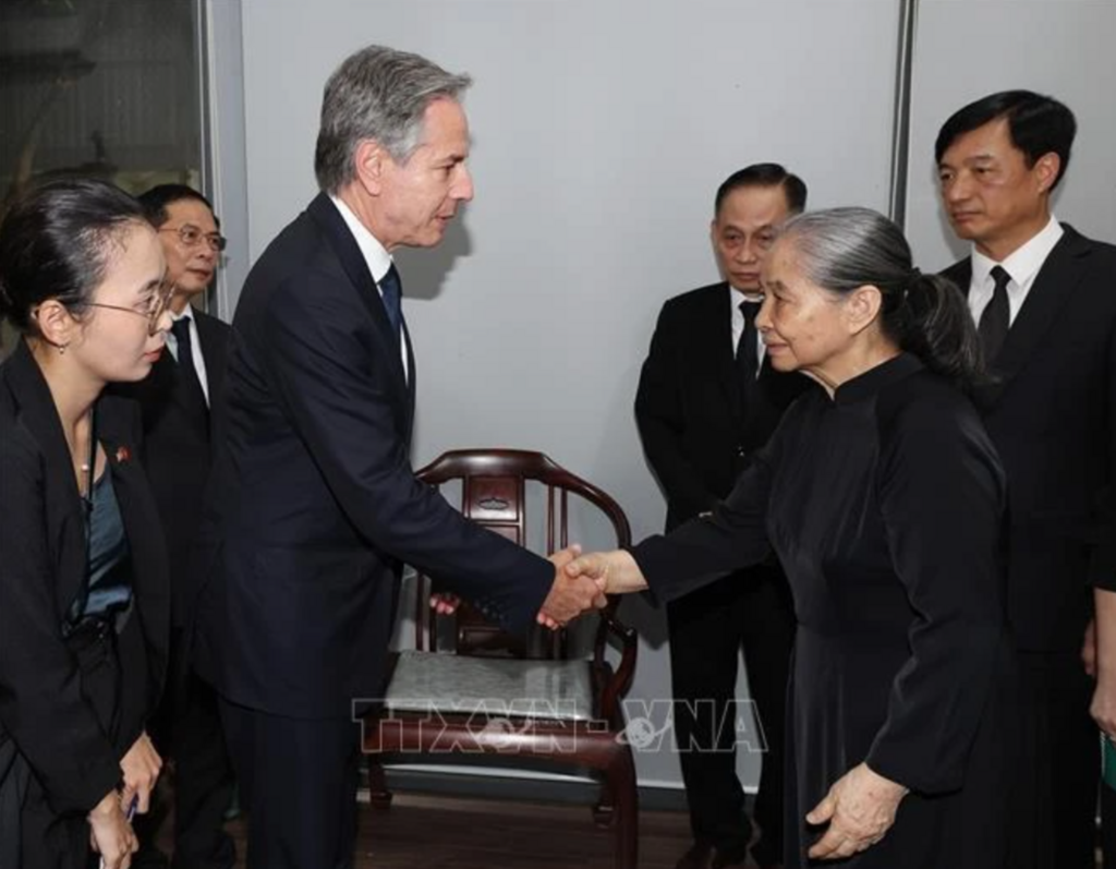 | US Secretary of State Antony Blinken expresses condolences to Party General Secretary Nguyen Phu Trong's spouse Madam Ngo Thi Man (right) (Photo: VNA) |