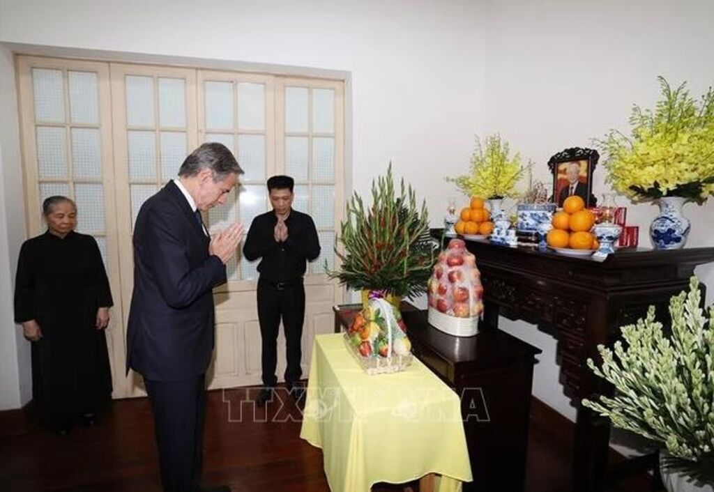 Hanoi (VNA) - US Secretary of State Antony Blinken, along with a US delegation sent by President Joe Biden, on July 27 evening came to offer incense in tribute to General Secretary of the Communist Party of Vietnam Central Committee Nguyen Phu Trong and extend condolences to the late leader's spouse Ngo Thi Man and his family at their residence on Thien Quang street in Hanoi.