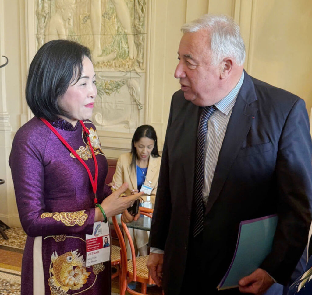 | Vice Chairwoman of the National Assembly (NA) Nguyen Thi Thanh (left) meets French Senate President Gérard Larcher on the sidelines of the APF-50. (Photo: VNA) |