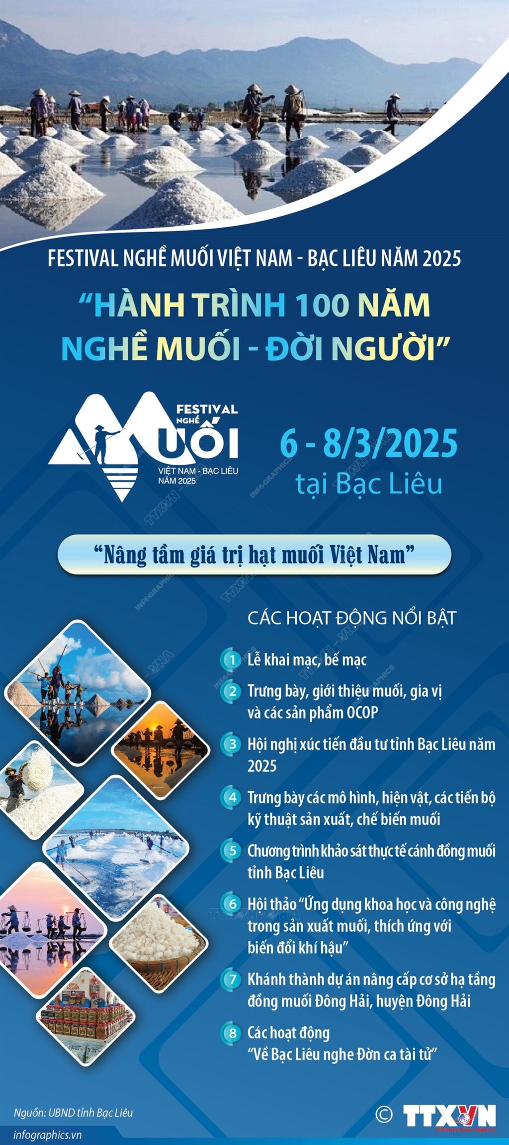 Festival nghề muối Việt Nam - Bạc Liêu năm 2025 diễn ra từ ngày 6 - 8/3/2025 tại Bạc Liêu với chủ đề “Nâng tầm giá trị hạt muối Việt Nam”. Festival có các hoạt động nổi bật như: Lễ khai mạc, bế mạc; không gian trưng bày, giới thiệu muối, gia vị và các sản phẩm OCOP; hội nghị xúc tiến đầu tư tỉnh Bạc Liêu năm 2025; không gian trưng bày các mô hình, hiện vật, các tiến bộ kỹ thuật sản xuất, chế biến muối; hội thảo “Ứng dụng khoa học và công nghệ trong sản xuất muối, thích ứng với biến đổi khí hậu”… Festival nhằm tôn vinh, bảo tồn, phát triển nghề muối truyền thống, nâng cao giá trị nghề muối Việt Nam nói chung, tỉnh Bạc Liêu nói riêng; khơi dậy tình yêu nghề truyền thống của thế hệ trẻ có trình độ tham gia vào hoạt động sản xuất, kinh doanh, khởi nghiệp từ nghề muối.