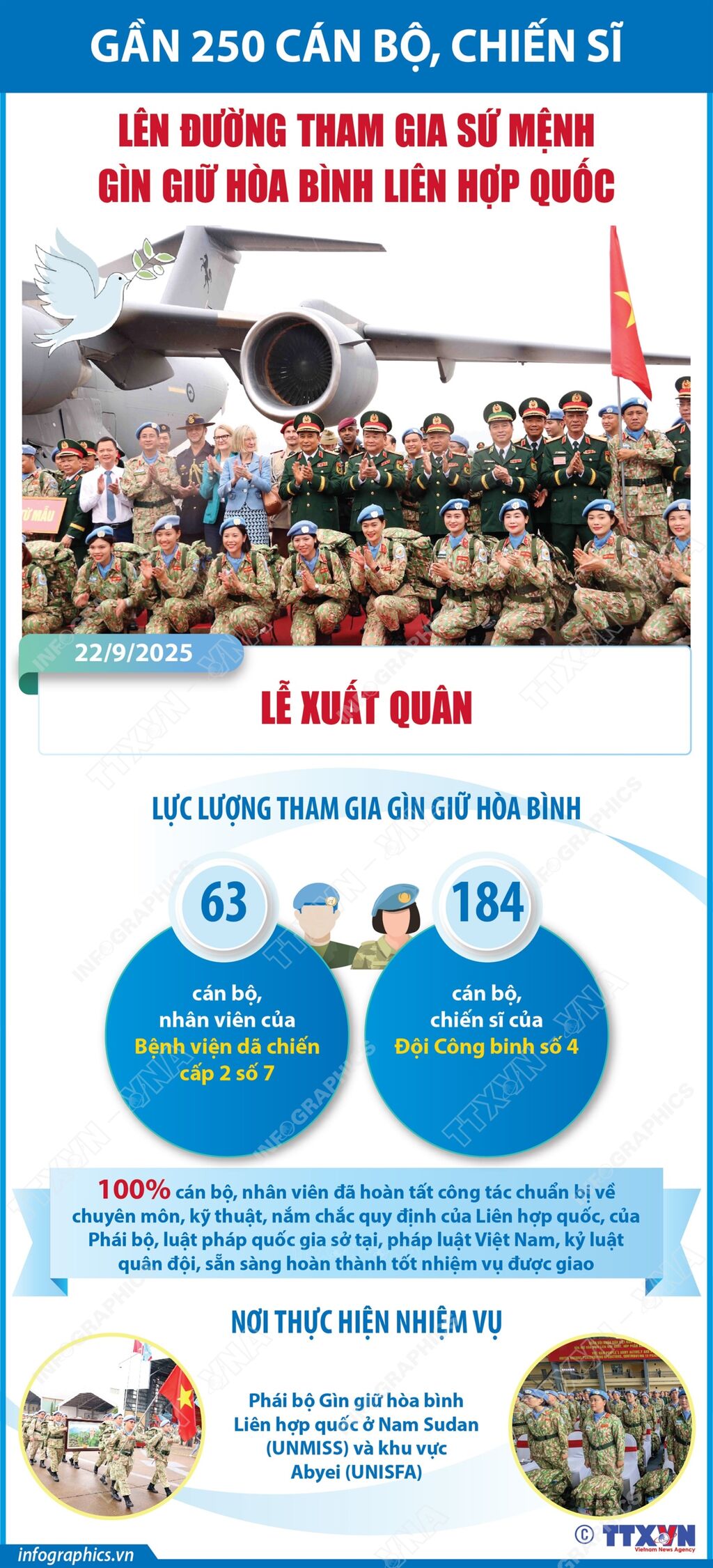 Sáng 22/9/2025, Bộ Quốc phòng tổ chức Lễ xuất quân Bệnh viện dã chiến cấp 2 số 7 và Đội Công binh số 4 lên đường thực hiện nhiệm vụ tại Phái bộ Gìn giữ hòa bình Liên hợp quốc ở Nam Sudan (UNMISS) và khu vực Abyei (UNISFA). Trong 11 năm qua, Việt Nam đã cử hơn 1.300 sỹ quan, quân nhân chuyên nghiệp của Quân đội nhân dân và Công an nhân dân tham gia hoạt động gìn giữ hòa bình Liên hợp quốc, được cộng đồng quốc tế ghi nhận, đánh giá cao.