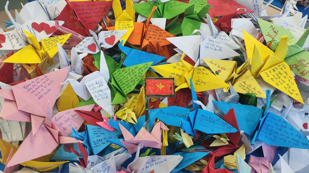 | Hạc giấy được học sinh tỉnh Hà Tĩnh gấp và viết lên những lời tri ân các Anh hùng liệt sĩ đã hy sinh trên Quần đảo Trường Sa. |