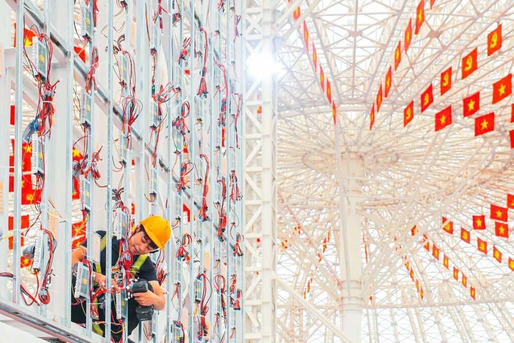 Trong những ngày này, tại Trung tâm Triển lãm Việt Nam (Đông Anh, Hà Nội), hàng trăm công nhân của các Bộ, Ban, ngành, địa phương, doanh nghiệp đang tăng tốc khẩn trương thi công những công đoạn cuối cùng cho công việc dựng gian trưng bày, trang trí cảnh quan đến hoàn thiện các hạng mục kỹ thuật cho Triển lãm thành tựu đất nước nhân dịp kỷ niệm 80 năm Quốc khánh với chủ đề: "80 năm Hành trình Độc lập - Tự do - Hạnh phúc", sẽ diễn ra từ ngày 28/8 - 5/9/2025. Ảnh: TTXVN