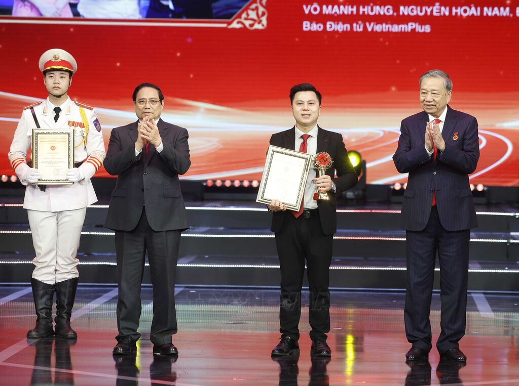 | Tổng Bí thư Tô Lâm và Thủ tướng Phạm Minh Chính trao giải A cho nhóm tác giả Báo điện tử VietnamPlus, Thông tấn xã Việt Nam. |