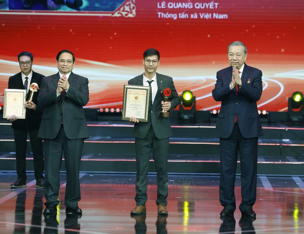 | Tổng Bí thư Tô Lâm và Thủ tướng Phạm Minh Chính trao giải A cho Nhà báo Lê Quang Quyết, Thông tấn xã Việt Nam. |