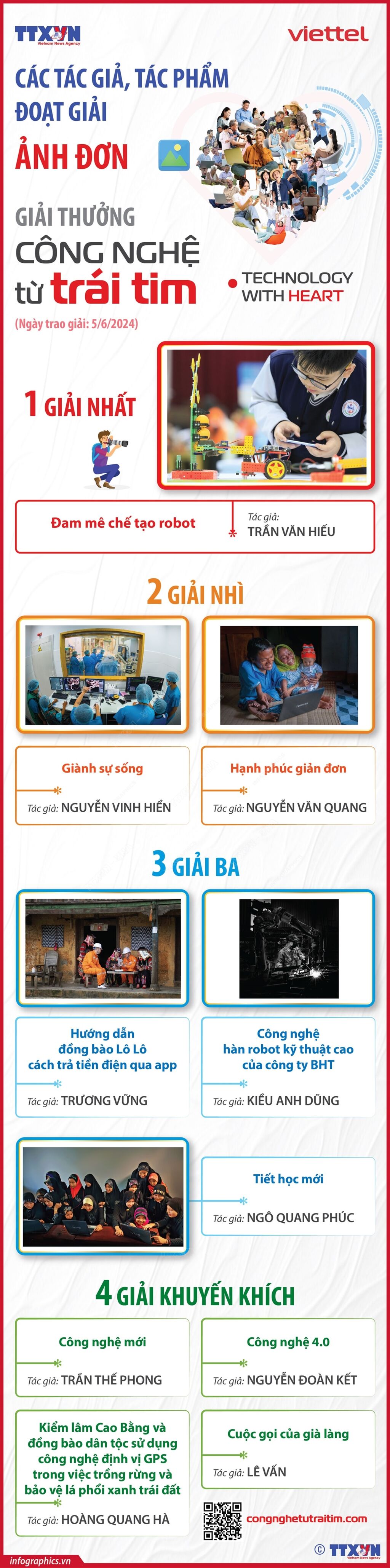 Lễ trao Giải thưởng ảnh và video clip với chủ đề “Công nghệ từ trái tim - Technology with heart” đã diễn ra sáng 5/6/2024, tại Trung tâm Thông tấn quốc gia (Hà Nội). Năm 2024, Ban tổ chức trao 1 giải Nhất, 2 giải Nhì, 3 giải Ba và 6 giải Khuyến khích cho các tác giả, tác phẩm đoạt giải ảnh bộ.