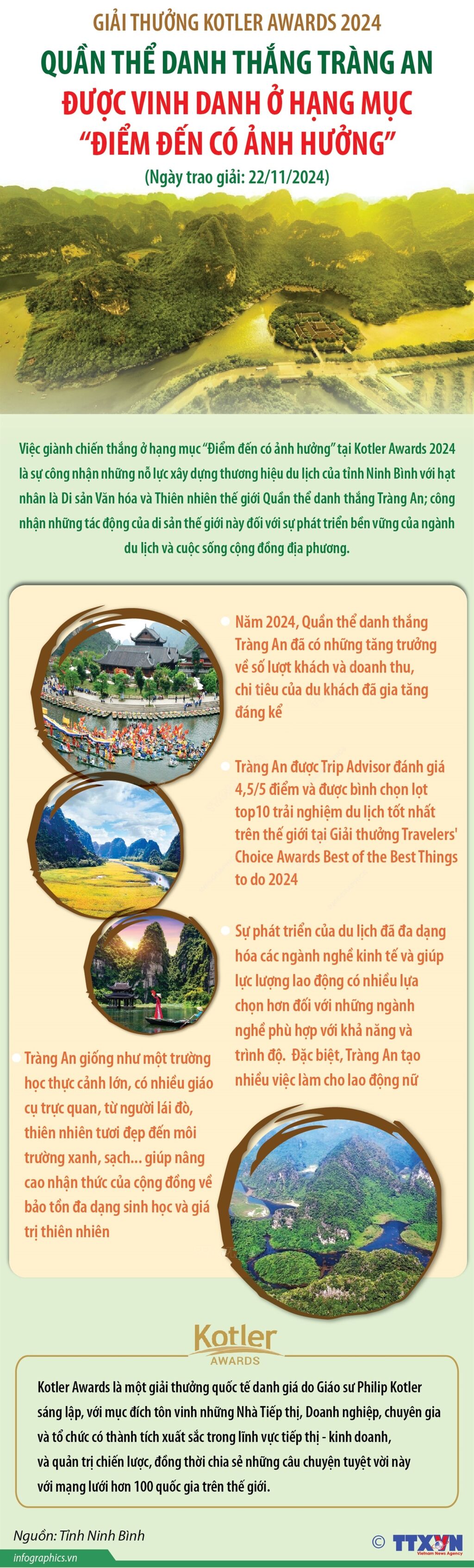 Tối 22/11/2024, tại Lễ trao giải thưởng Kotler 2024 diễn ra tại TP Hồ Chí Minh, Di sản Văn hóa và Thiên nhiên thế giới Quần thể danh thắng Tràng An vinh dự được trao giải “Impactful destination” - “Điểm đến có ảnh hưởng”. Việc giành chiến thắng ở hạng mục “Impactful destination” - “Điểm đến có ảnh hưởng”tại Kotler Awards 2024 chính là một sự công nhận xứng đáng cho những nỗ lực xây dựng thương hiệu du lịch của tỉnh Ninh Bình với hạt nhân là Quần thể danh thắng Tràng An; cũng như những tác động của di sản thế giới này đối với sự phát triển bền vững của ngành du lịch và cuộc sống cộng đồng địa phương.