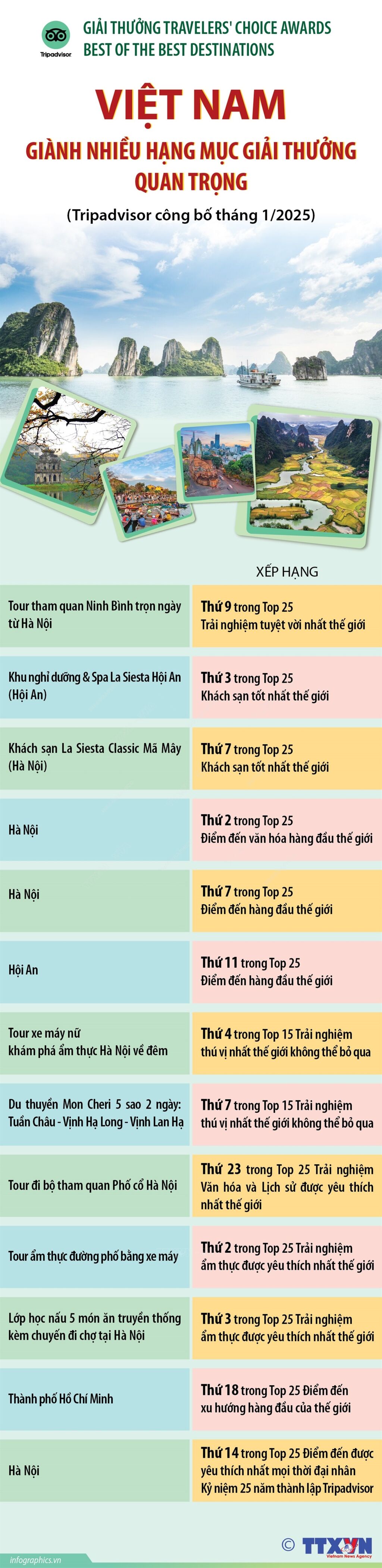 Tripadvisor tháng 1/2025 đã công bố top 10 Trải nghiệm thú vị không thể bỏ qua năm 2025. Đây là những cái tên nằm trong hạng mục "Best of the Best" thuộc khuôn khổ giải thưởng Travelers' Choice Awards do chính người dùng trên nền tảng du lịch này bình chọn. Việt Nam có hai đại diện lọt vào danh sách này.