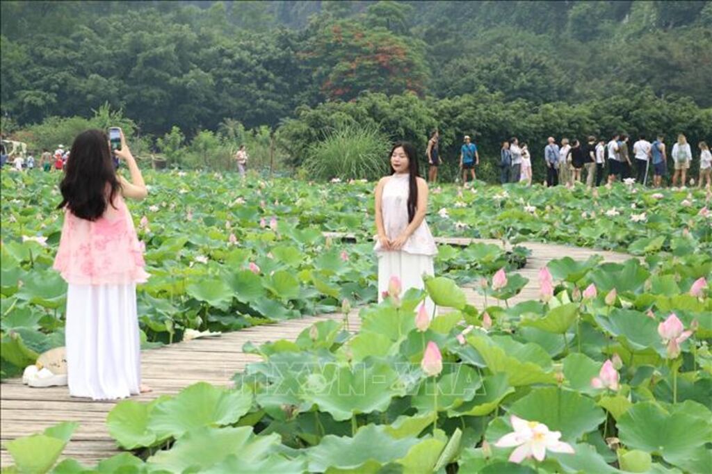 | Các đầm sen nở rộ tại Ninh Bình thu hút rất đông người dân và du khách đến chụp ảnh. |