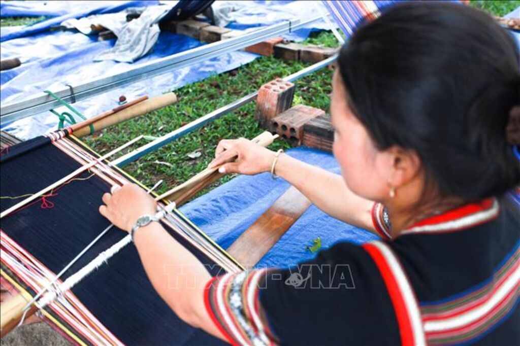 | Nghệ nhân Y Tủi (người Bahnar, xã Kroong, thành phố Kon Tum, tỉnh Kon Tum) mang nghề dệt thổ cẩm đến trình diễn tại lễ hội. |