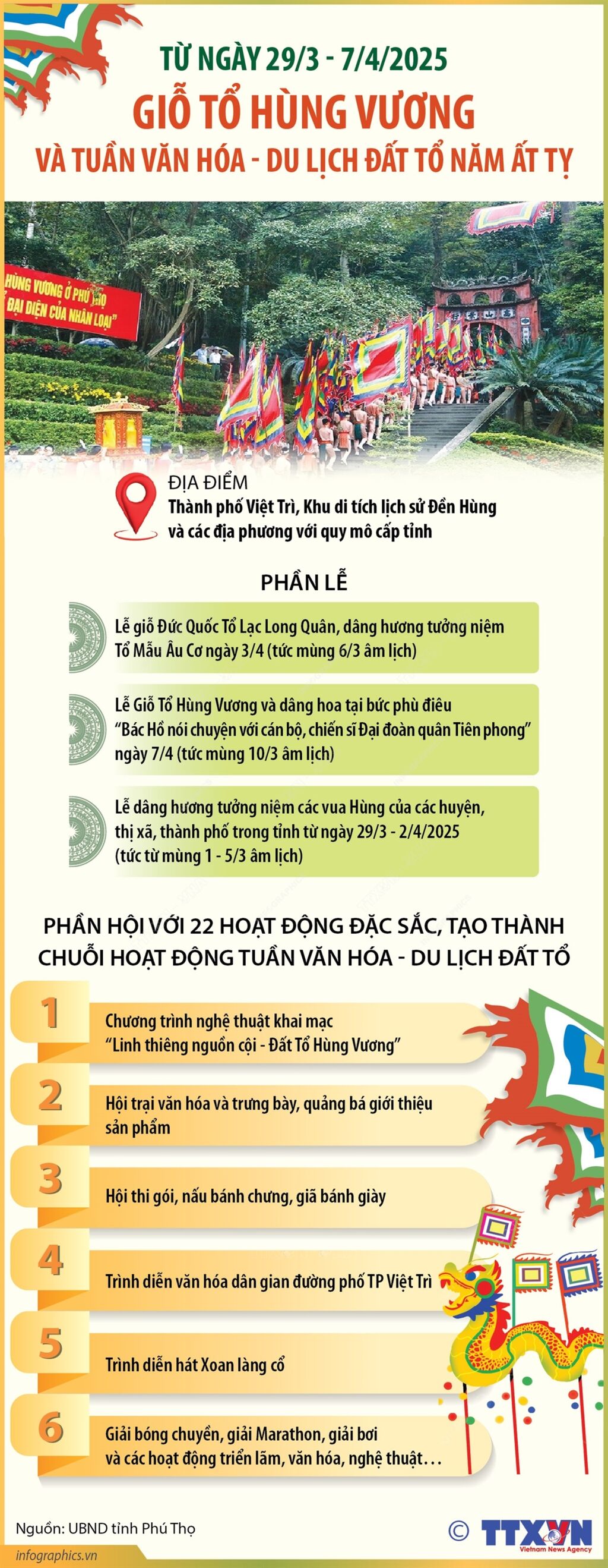 Giỗ Tổ Hùng Vương và Tuần Văn hóa - Du lịch Đất Tổ năm Ất Tỵ 2025 diễn ra từ ngày 29/3 đến 7/4/2025 (tức từ mùng 1-10/3 năm Ất Tỵ) tại thành phố Việt Trì, Khu di tích lịch sử Đền Hùng và các địa phương với quy mô cấp tỉnh. Việc tổ chức Giỗ Tổ Hùng Vương và Tuần Văn hóa - Du lịch Đất Tổ năm Ất Tỵ nhằm giáo dục truyền thống yêu nước, biết ơn sâu sắc các vua Hùng và bậc tiền nhân đã có công dựng nước, giữ nước; giáo dục truyền thống đạo lý “Uống nước nhớ nguồn”. Sự kiện năm nay hứa hẹn sẽ mang đến những hoạt động phong phú, từ các nghi lễ truyền thống tại Đền Hùng, các chương trình văn hóa đặc sắc cho đến những hoạt động du lịch hấp dẫn. Đây là dịp để người dân cả nước và du khách quốc tế hiểu thêm về nguồn cội dân tộc, đồng thời thúc đẩy phát triển du lịch văn hóa địa phương, quảng bá vẻ đẹp và tiềm năng du lịch của Phú Thọ.