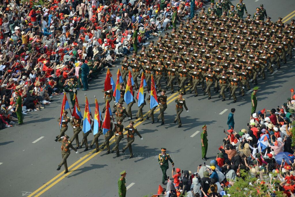 | Khối diễu binh kỷ niệm 50 năm ngày Giải phóng miền Nam thống nhất đất nước đi giữa rừng cờ hân hoan của người dân. Ảnh: Nhóm PV báo Tin tức và Dân tộc |