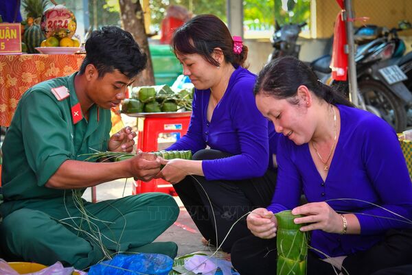 | Cán bộ, chiến sĩ Bộ đội Biên phòng Kiên Giang và Hội LHPN gói bánh tét tặng cho người dân. |