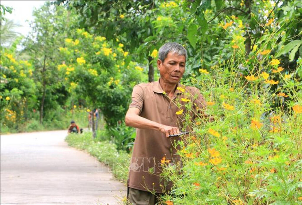 | Ông Sơn Xâm, xã Đông Bình (thị xã Bình Minh, tỉnh Vĩnh Long) chăm sóc hoa trước nhà nhằm tạo mỹ quan cho tuyến đường liên ấp. |
