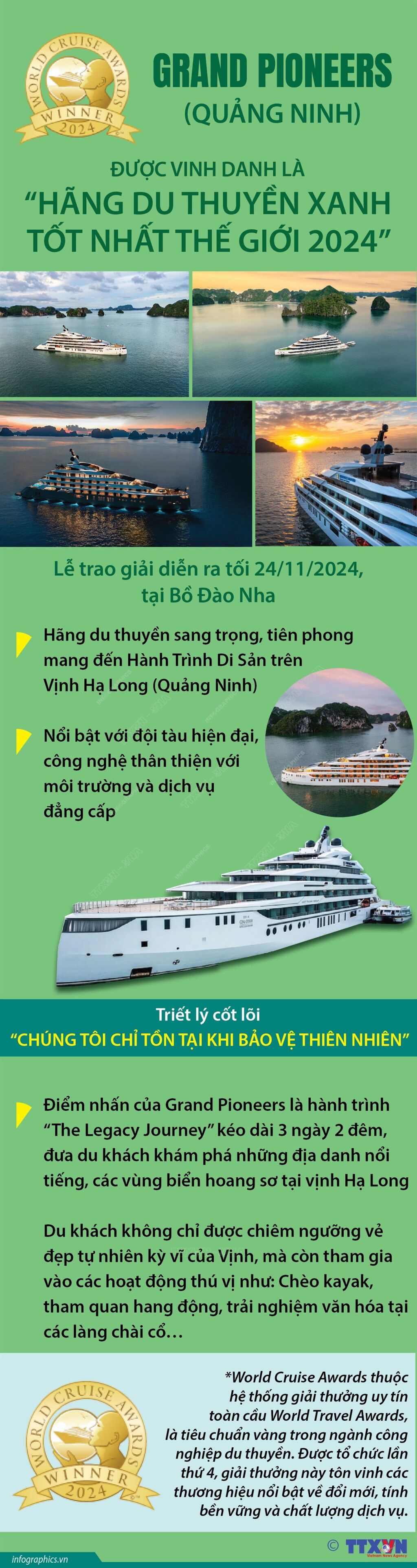 Du thuyền Grand Pioneers Cruise trên Vịnh Hạ Long được vinh dự là đơn vị đầu tiên của Việt Nam nhận giải “Hãng du thuyền xanh tốt nhất thế giới 2024” tại World Cruise Awards. Đây không chỉ là niềm tự hào lớn lao cho Grand Pioneers mà còn đánh dấu bước tiến quan trọng của ngành du thuyền Việt Nam trên bản đồ thế giới.