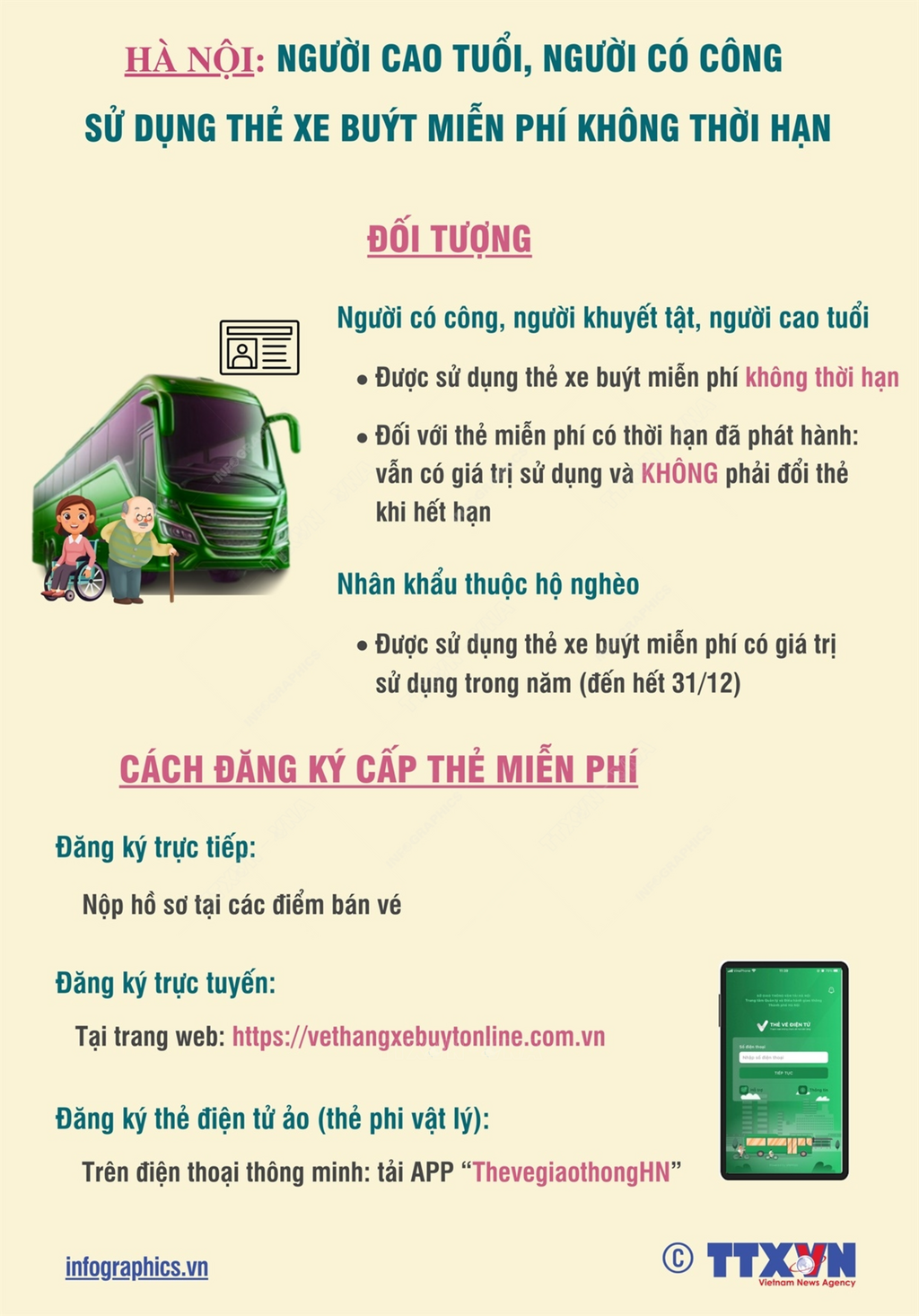 Theo thông tin từ Trung tâm Quản lý và điều hành giao thông thành phố Hà Nội chiều 29/10/2024, thành phố đã quyết định bỏ thời hạn thẻ miễn phí sử dụng phương tiện vận tải hành khách công cộng đối với người có công, người khuyết tật, người cao tuổi.